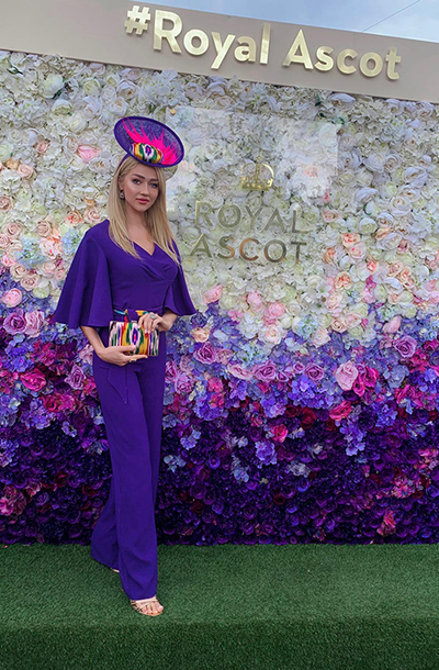 Strangely enough, I decided to wear a jumpsuit as well on Ladies' Day. I chose to wear a purple jumpsuit by Venera Tabakin with a matching hat by the amazing milliner Anna Gilder and colourful clutch bag. Which ensemble do you think looks more stylish? If you think my outfit looks better, you will be pleased to know that it is available at WWW.AKPREMIER.COM for only £325 - nearly a fifth of the cost of Countess of Wessex £1,500 jumpsuit. You can also get all my accessories at www.akpremier.com and still cost several hundreds of pounds lower than the £1,500 for just the Countess of Wessex jumpsuit, let alone the cost for her accessories. |